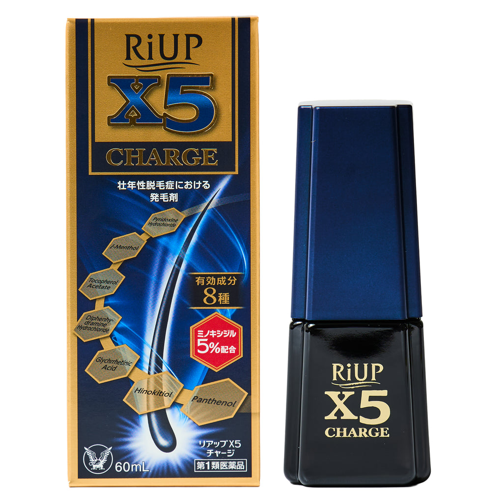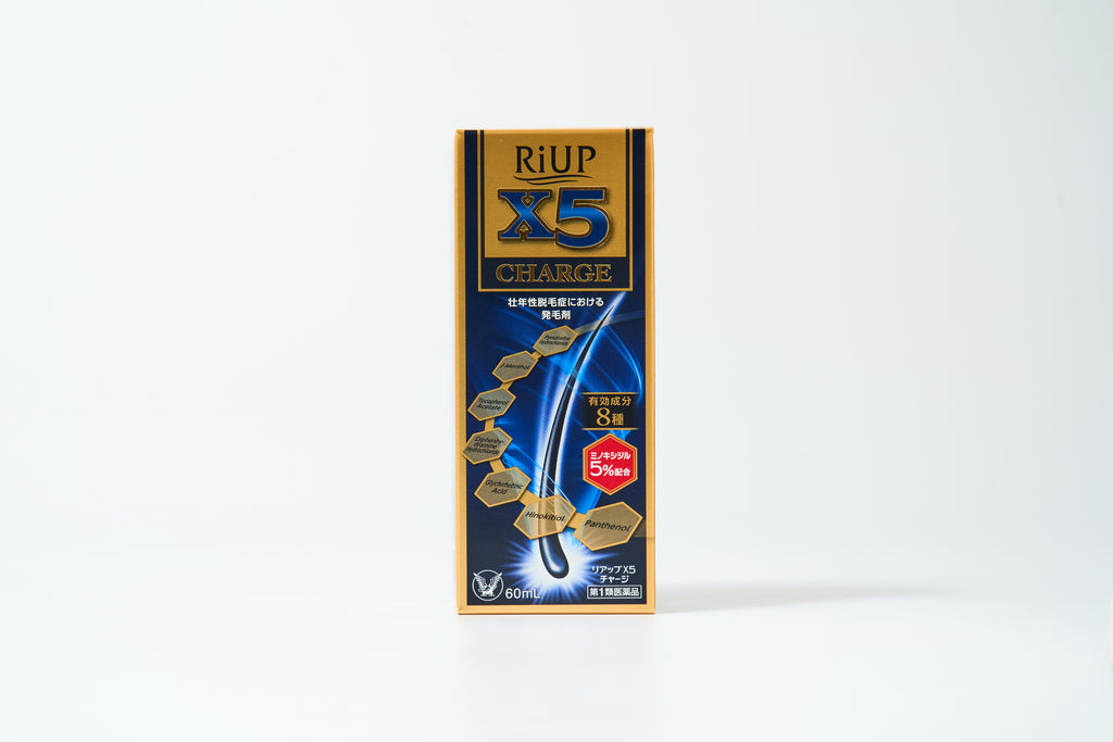 ●リアップX5チャージは、一般用医薬品において日本で唯一の発毛成分ミノキシジルを国内最大濃度※5%配合した男性用の発毛剤です。
