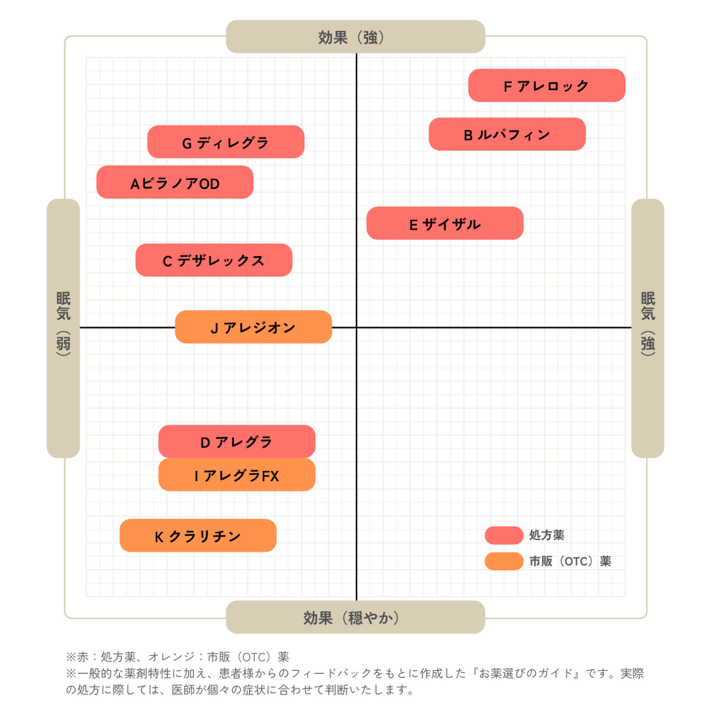 ● 有効成分の「ロラタジン」は、脳内への移行性が低い非鎮静性成分ですので、眠くなりにくい、集中力が低下しにくいといった特長があります